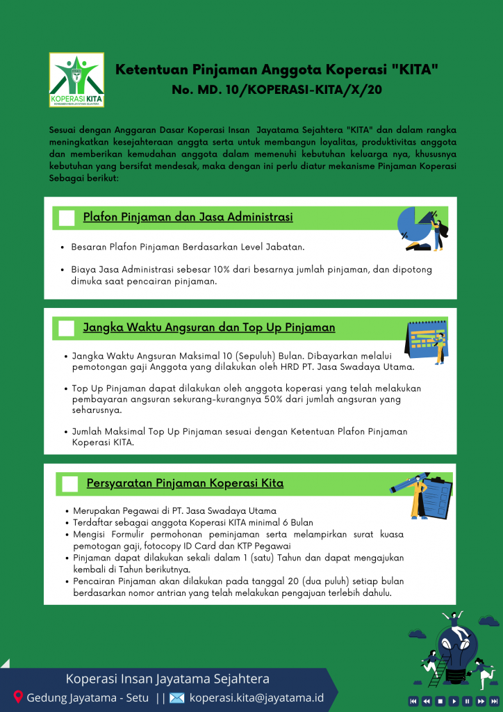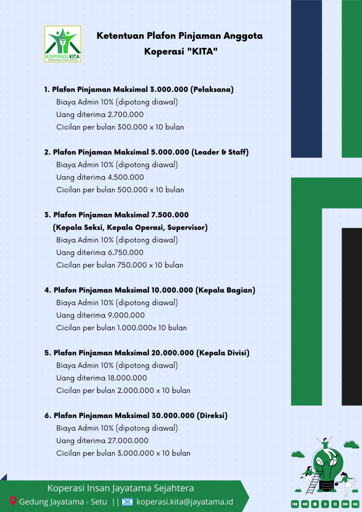 Peminjaman Produk Peminjaman Koperasi KITA yang menawarkan Pinjaman Tunai kepada Anggota Formulir Terkait Peminjaman Ketentuan Pinjaman Anggota Koperasi KITA ( Download PDF ) Ketentuan Plafon Pinjaman Anggota Koperasi KITA ( Download PDF ) Formulir Peminjaman Tunai Anggota ( Download PDF )